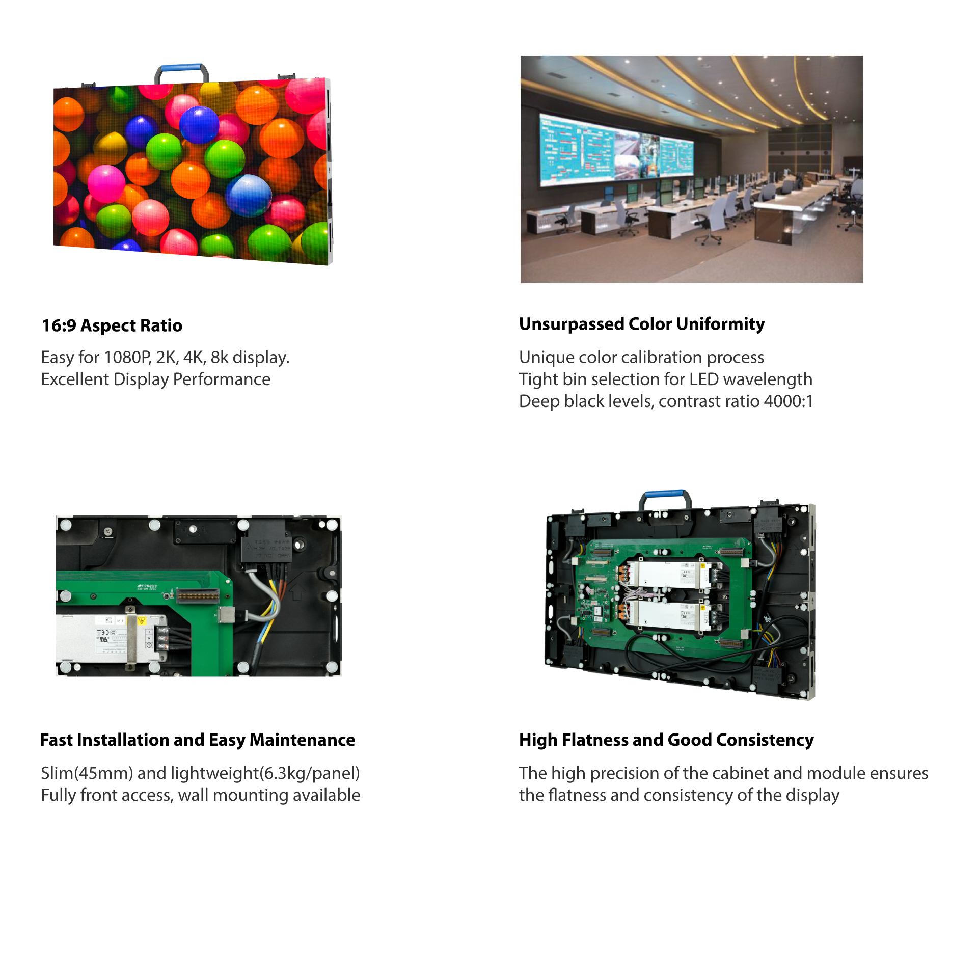 Product Introduction:16:9 Ultra HD LED Display. The panel size is 600×337.5mm. The pixel pitch can be available from P0.7-P2.3, which can easily achieve 2k, 4k, 8k resolution with SMD, GOB and COB technology.